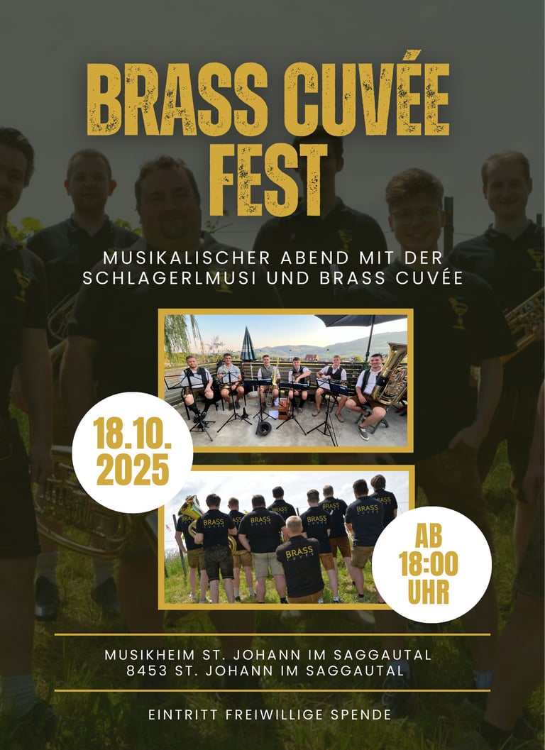 Wir möchten dich herzlich zu unserem Brass-Cuvée-Fest am 18. Oktober ab 18 Uhr im Musikheim St. Johann im Saggautal einladen. Es erwartet dich ein gemütlicher, festlicher Abend bei bester Stimmung und guter Musik. Als musikalischen Gast haben wir dieses Jahr die Schlagerlmusi aus der Oststeiermark eingeladen. Die Burschen überzeugen stets mit Charme und musikalischem Talent, wenn sie ihre traditionellen Volksmusikstücke zum Besten geben.